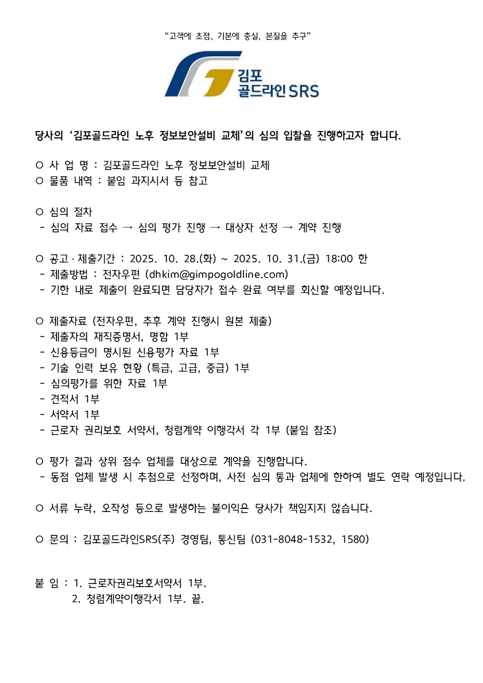 김포골드라인 노후 정보보안설비 교체 심의 입찰 공고 알림